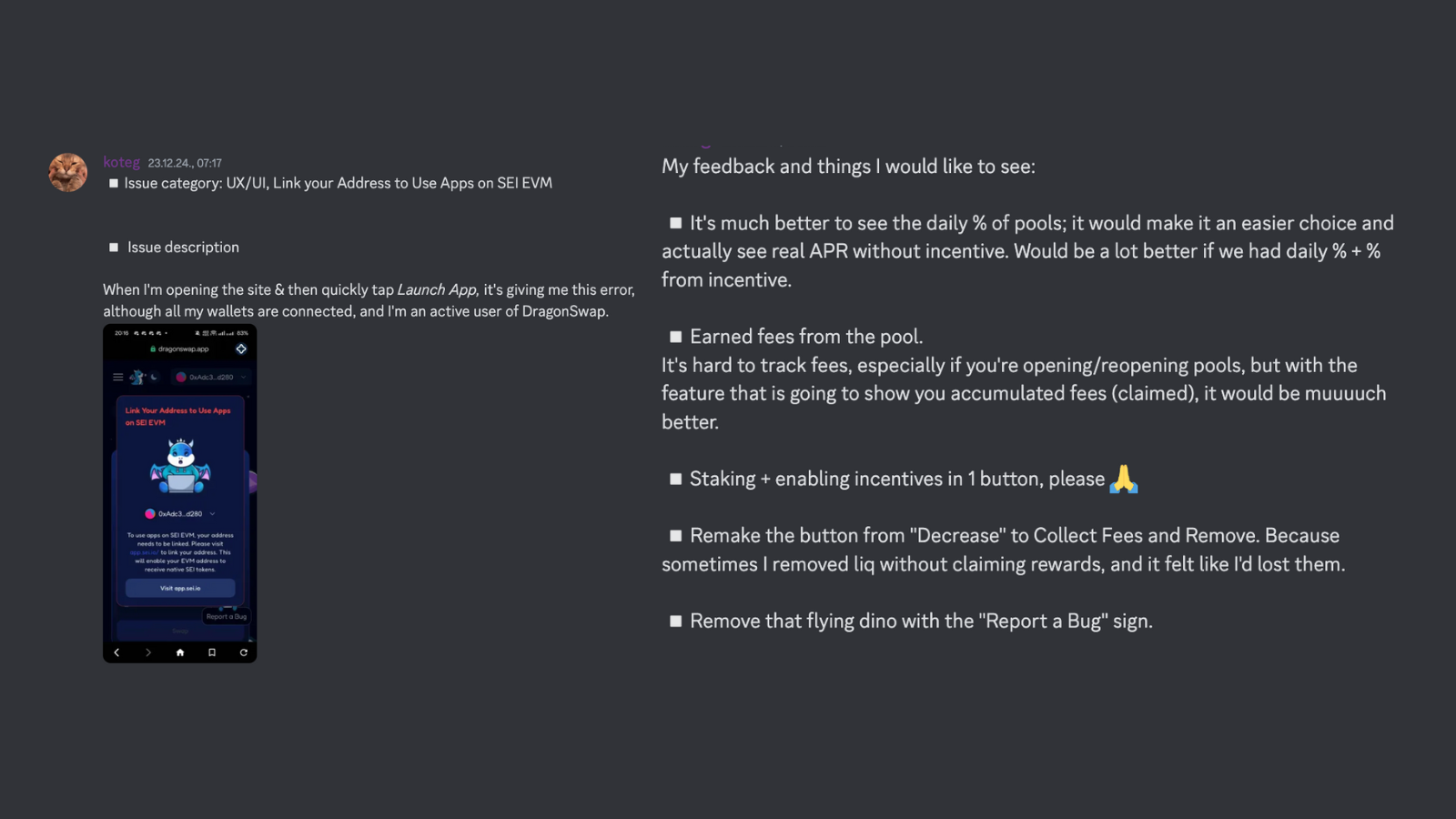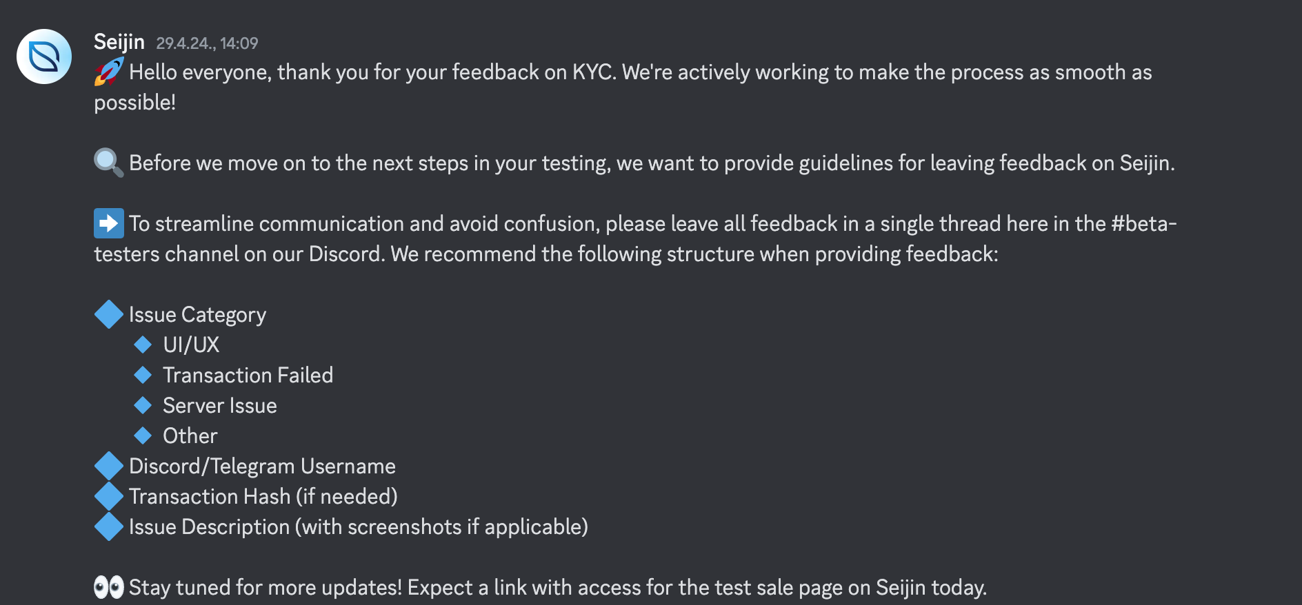 We learned early that organized feedback is effective feedback. To keep communication smooth and avoid confusion, we gave testers a clear structure to follow. The categories depended on the product and its stage. For Seijin, our community-driven launchpad, this included: